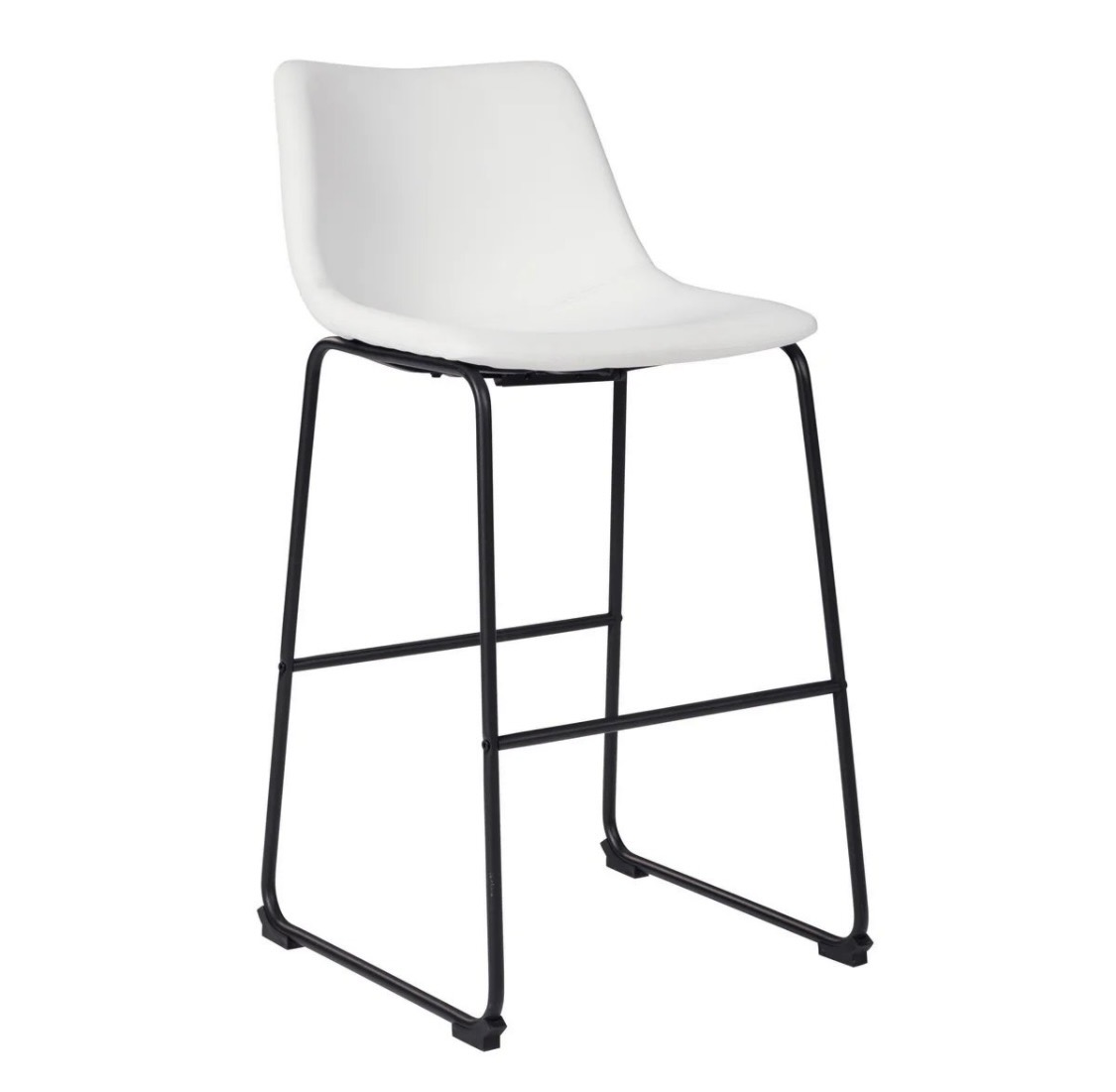 With its distinctive contoured bucket seat and tubular metal base, this bar stool serves up a fresh twist on mid-century inspired style. Faux leather upholstery has a charmingly vintage tone. What a timeless look for eat-in kitchens and casually cool dining rooms. Some assembly may be required.